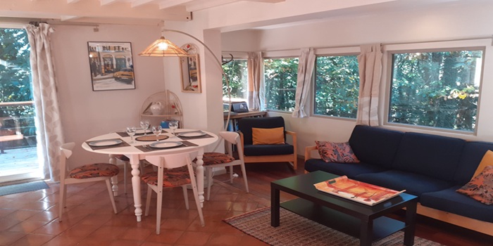 séjour avec coin cuisine/bar, coin repas et petit salon,