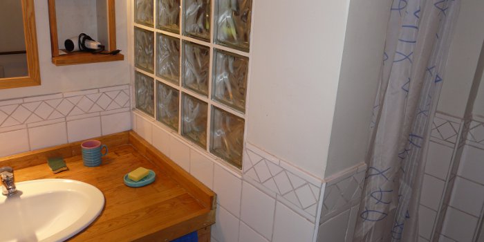 Située à côté de la chambre du bas, la salle d’eau comporte une douche spacieuse avec banc carrelé, une vasque, des étagères intégrées, une machine à laver et un meuble de rangement en L qui offre une confortable surface de pose sur toute la longueur de deux murs. Le bouton de réglage de la VMC se trouve dans la salle d’eau.